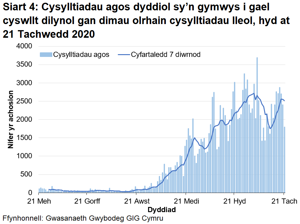 Mae siartiau 3 a 4 yn cynrychioli’r nifer ddyddiol o achosion positif a’r cysylltiadau agos sy’n gymwys i gael cyswllt dilynol. Gall nifer yr achosion sy’n gymwys am gyswllt dilynol ar gyfer yr wythnosau diwethaf fod ychydig yn wahanol i’r cyhoeddiadau blaenorol oherwydd bod achosion wedi’u nodi fel rhai anghymwys yn dilyn ymchwiliad pellach gan dimau olrhain cysylltiadau. Gallwch weld rhagor o fanylion am y broses hon yn yr adran wybodaeth am ansawdd a methodoleg.