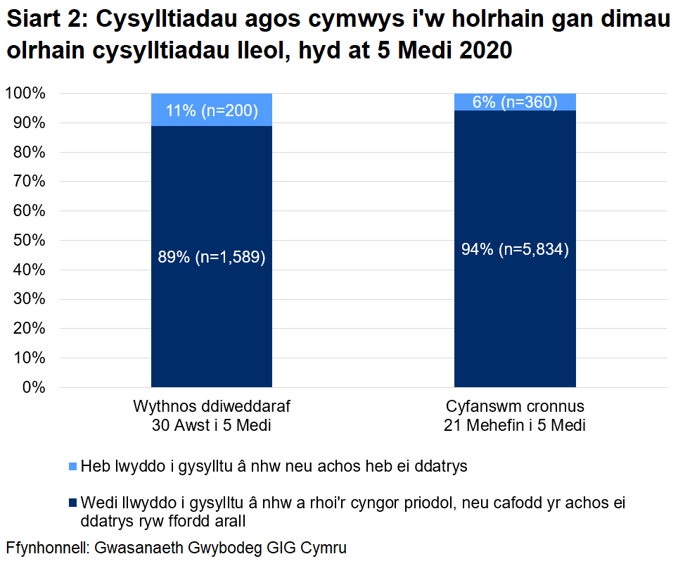 - o blith y 1,789 o gysylltiadau agos a oedd yn gymwys i'w holrhain, cysylltwyd a chynghorwyd â 1,589 (89%) yn llwyddiannus, neu chafwyd eu hachos ei ddatrys yn syth