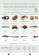 Poster sy’n dangos maint lleiaf y ddalfa ar gyfer rhywogaethau pysgod a physgod cregyn a sut i’w mesur.