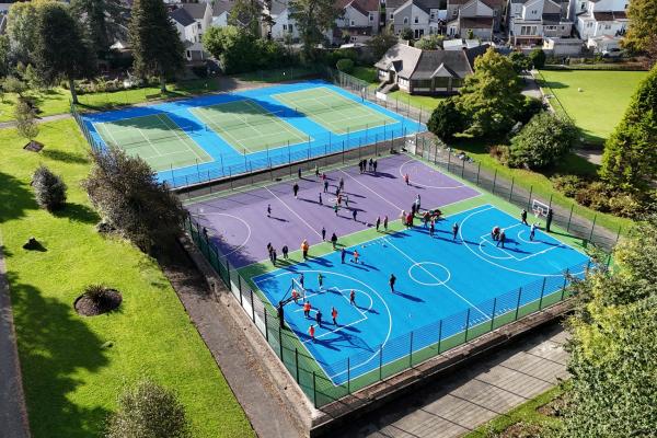Agorodd dau o'r cyrtiau newydd hyn yr wythnos hon ym Mharc Lles Maesteg, gan drawsnewid hen gyrtiau tenis yn gyfleusterau pêl-fasged a phêl-rwyd pwrpasol, sydd bellach yn cynnwys arwynebau llawr amryliw, llinellau ac offer cwrt.