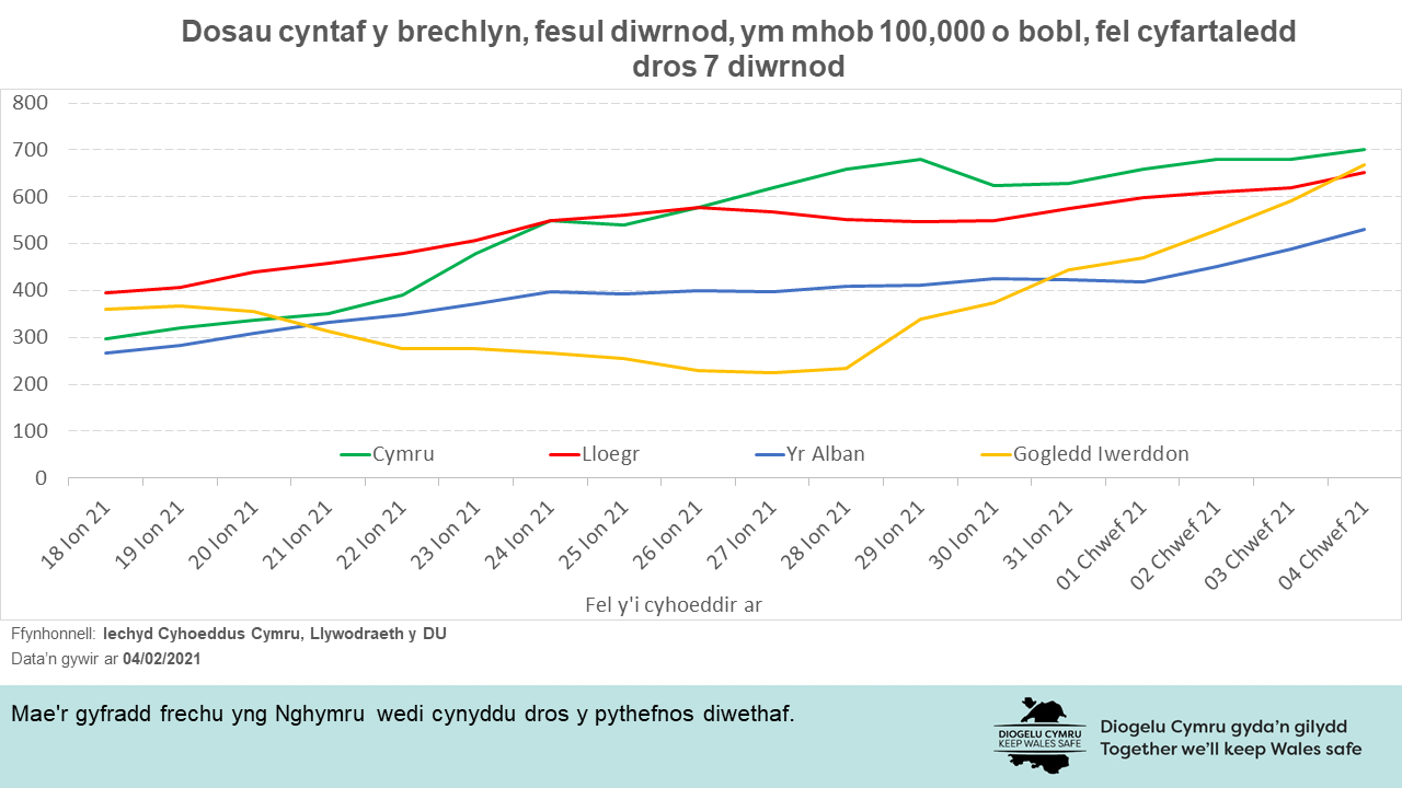 Ffynhonnell: Ddangosfwrdd Gwyliadwriaeth COVID-19 Cyflym Iechyd Cyhoeddus Cymru a Coronafeirws (COVID-19) yn y DU (GOV.UK)