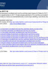 - Ymatebodd Awdurdodau Tân ac Achub Cymru i 2,090 o danau glaswelltir, cnydau a choedwigoedd yn 2017-18, cynyddiad o 22% ar 2016-17. Mae nifer y tanau hyn yn dueddol o amrywiad ac mae'r ffigur 2017-18 yn dilyn cyfnod o ansefydlogrwydd. Ffigur 2017-18 yw’r ail isaf yn y gyfres (ers 2001-02).