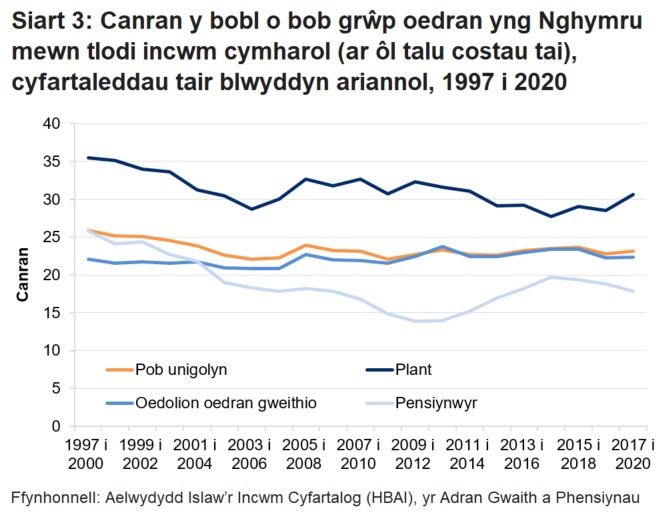 - Plant yw’r grŵp oedran mwyaf tebygol o fod mewn tlodi incwm cymharol yn gyson; ac mae hynny’n wir ar gyfer pob un o bedair gwlad y DU. Rheswm posibl am hyn yw bod oedolion â phlant yn fwy tebygol o fod yn ddi-waith neu yn gweithio llai o oriau oherwydd cyfrifoldebau gofal plant. (siart 3)