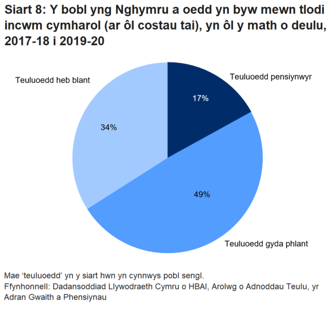 Yn y gorffennol, roedd y rhan fwyaf o bobl a oedd yn byw mewn tlodi incwm cymharol yn byw ar aelwydydd â phlant. Fodd bynnag, mae'r patrwm bellach yn llai clir gyda chyfran debyg o'r rhai sy'n byw mewn tlodi incwm cymharol yn byw ar aelwydydd â phlant a heb blant (gweler siart 8).