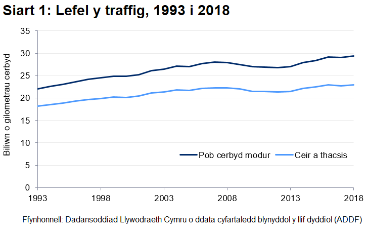 Mae Siart 1 yn dangos y duedd hirdymor ar gyfer lefelau traffig rhwng 1993 a 2018. Yn y cyfnod hwn, mae lefelau’r traffig wedi cynyddu 33.0%, gan gyrraedd ei anterth o 29.4 biliwn cilometr cerbyd yn 2018. Gwelwyd cynnydd graddol yn lefelau’r traffig hyd at 2007 a chwymp yn ystod y dirywiad economaidd. Ers 2012, gwelwyd cynnydd eto yn lefelau’r traffig.