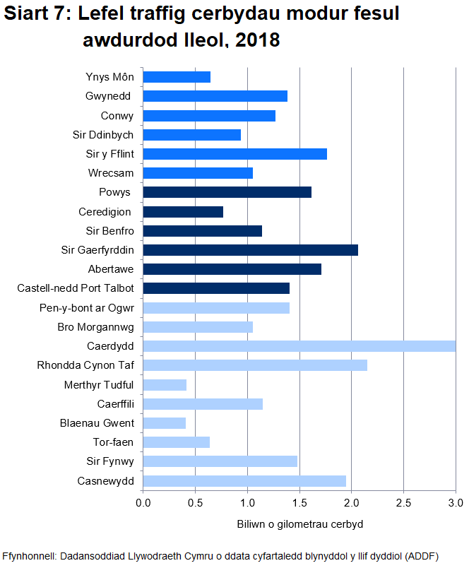 Mae Siart 7 dangos cyfaint traffig amcangyfrifedig ar gyfer 22 awdurdod lleol yn 2018. Gwelwyd y lefelau uchaf o draffig cerbydau modur yng Nghaerdydd, Rhodda Cynon Taf, Sir Gaerfyrddin a Chasnewydd. Gyda'i gilydd roedd y lefelau traffig yn yr ardaloedd hyn yn 31.1% o gyfanswm y traffig yng Nghymru. Gwelwyd y lefelau isaf o draffig cerbydau modur yn Nhorfaen, Merthyr Tudful, Blaenau Gwent ac ar Ynys Môn. Gyda'i gilydd roedd y lefelau traffig yn yr ardaloedd hyn yn 7.2% yn unig o gyfanswm y traffig yng Nghymru. Ar y cyfan mae'r ffigurau hyn yn adlewyrchu lle mae pobl yn byw ac yn gweithio yng Nghymru.