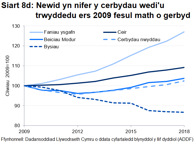 Nid yw'r newid yn y cerbydau trwyddedig yn gyson ar gyfer mathau gwahanol o gerbydau (Siart 8d). Er enghraifft, mae’r fynegai ar gyfer bysiau (gan gynnwys coetsis) wedi gostwng bob blwyddyn ers 2010. Ar y llaw arall, mae nifer y ceir a faniau ysgafn wedi cynyddu bob blwyddyn ac mae beiciau modur ac HGVs wedi cynyddu ers 2012.