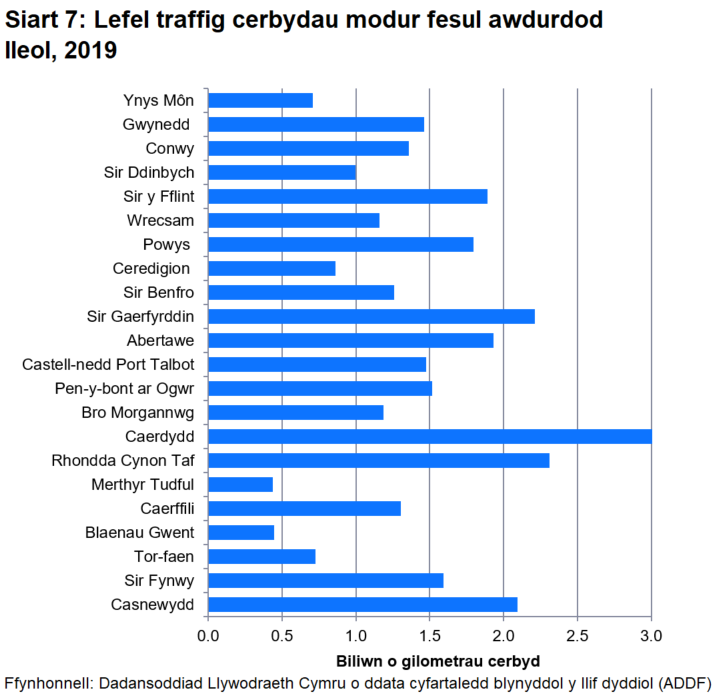 Mae Siart 7 dangos cyfaint traffig amcangyfrifedig ar gyfer 22 awdurdod lleol Cymru yn 2019. Gwelwyd y lefelau uchaf o draffig cerbydau modur yng Nghaerdydd, Rhodda Cynon Taf, Sir Gaerfyrddin a Chasnewydd. Gyda'i gilydd roedd y lefelau traffig yn yr ardaloedd hyn yn 31.2% o gyfanswm y traffig yng Nghymru. Gwelwyd y lefelau isaf o draffig cerbydau modur yn Nhorfaen, Merthyr Tydfil, Blaenau Gwent ac ar Ynys Môn. Gyda'i gilydd roedd y lefelau traffig yn yr ardaloedd hyn yn 7.2% yn unig o gyfanswm y traffig yng Nghymru. Ar y cyfan mae'r ffigurau hyn yn adlewyrchu lle mae pobl yn byw ac yn gweithio yng Nghymru. O'r 22 awdurdod lleol, Caerdydd a gofrestrodd y 3.4 bvk uchaf. Yn gyffredinol, mae'r ffigurau hyn yn adlewyrchu lle mae pobl yn byw ac yn gweithio yng Nghymru.