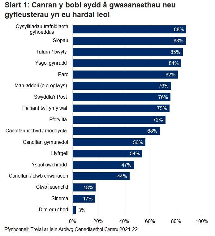 Gofynnwyd i bobl pa wasanaethau a chyfleusterau oedd ar gael yn eu hardal leol (Siart 1). Y gwasanaethau mwyaf cyffredin a gofnodwyd yw cysylltiadau trafnidiaeth gyhoeddus (dywedodd 88% fod ganddynt y rhain), siopau (88%), a thafarndai/bwytai (85%). Dywedodd 3% nad oes ganddynt unrhyw wasanaethau na chyfleusterau yn eu hardal leol, canlyniad tebyg i'r adeg pan ofynnwyd y cwestiwn hwn ddiwethaf yn 2018-19.