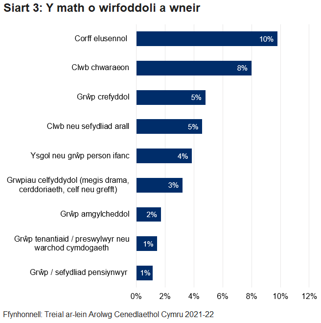 o bobl yn gwirfoddoli gyda chlybiau neu sefydliadau
