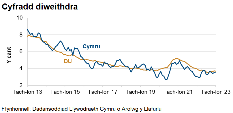 Roedd y gyfradd diweithdra yng Nghymru yn 3.5%. Mae hyn i lawr ychydig ar y chwarter ac i fyny 0.5 pwynt canran ers yr un cyfnod flwyddyn ynghynt.
