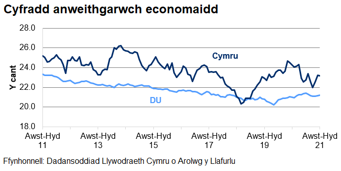 Roedd y gyfradd anweithgarwch economaidd ar gyfer y DU yn 21.2%. Mae hyn i fyny ychydig ar y chwarter ac i fyny 0.2 pwynt canran ers yr un cyfnod flwyddyn ynghynt.