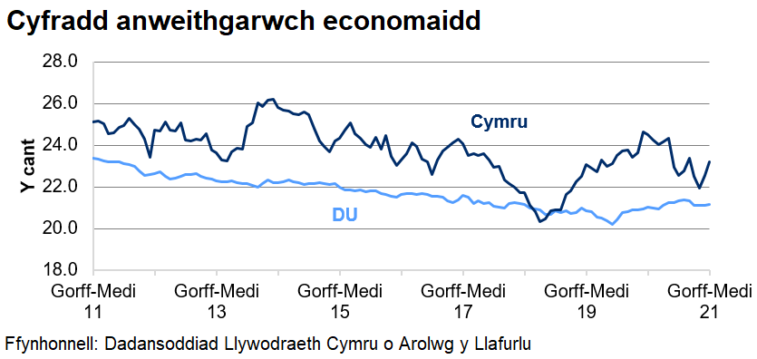 Roedd y gyfradd anweithgarwch economaidd ar gyfer y DU yn 21.1%, heb newid ers y chwarter blaenorol ac ychydig yn uwch na’r un cyfnod flwyddyn ynghynt.