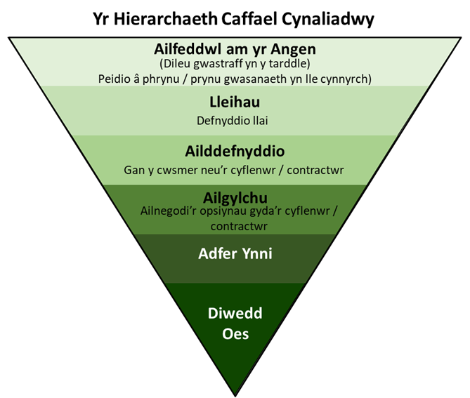 - Ailfeddwl am yr angen: dileu gwastraff yn y tarddle (Peidio â phrynu / prynu gwasanaeth yn lle cynnyrch)