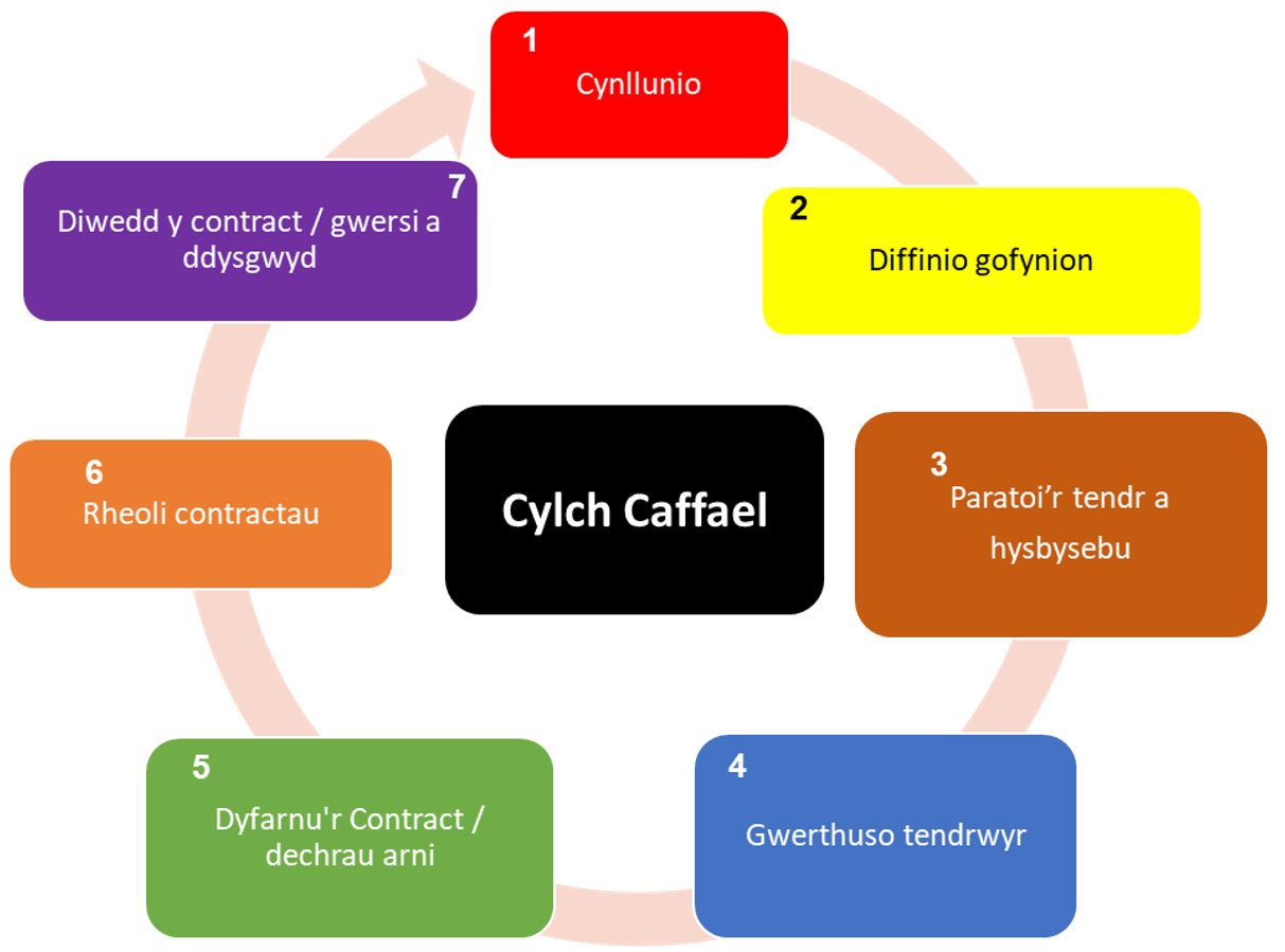 Drwy ystyried y materion a chymryd y camau a nodir yng nghamau 1 – 7 isod, gallwch sicrhau bod yr angen i ystyried CO2e yn cael ei ymgorffori yn y broses gaffael. Camau 2 – 5 yw eich cyfle i ddefnyddio cynigion i leihau allyriadau CO2e i wahaniaethu rhwng tendrau wrth eu gwerthuso, gan ganiatáu i'r cyflenwyr, y contractwyr neu’r darparwyr gwasanaethau hynny sydd fwyaf tebygol o'ch helpu i weithio tuag at ddatgarboneiddio gyflwyno eu cynnig ac ennill sgôr dda.