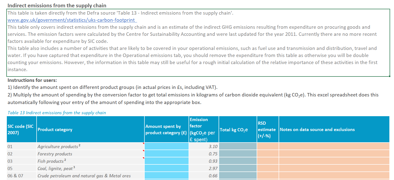 Defnyddir data cyfartalog ar allyriadau'r diwydiant, i gynhyrchu ffactorau ar gyfer unedau safonol e.e. dosbarth/maint y cerbydau a ddefnyddir, kg/Co2e fesul km /milltir, litrau o danwydd, tunelli; gallai cyfartalog olygu allyriadau fesul uned a brynir, e.e. allyriadau arferol ar gyfer gliniadur a brynir o restr o allyriadau cylch bywyd at ati. Er enghraifft, Adroddiadau BEIS ar nwyon tŷ gwydr: ffactorau trosi 2020.