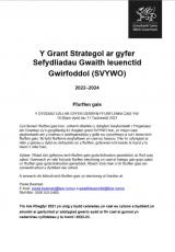 Y dyddiad cau ar gyfer derbyn ffurflenni cais mewn perthynas â chylch cyllido SVYWO 2025 i 2028 yw 12.00pm, 8 Tachwedd 2024.