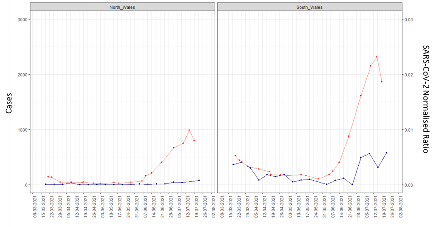 In North Wales up to the w/e 25 July 2021 the Wrexham, Anglesey (Llangefni) and Kinmel Bay sites continue to show increasing levels of SARS-CoV-2 detected in wastewater despite the number of cases detected though community testing having declined or remained stable in that same period. Despite the case numbers declining the wastewater signal suggests the infection cases have not declined in those areas.
