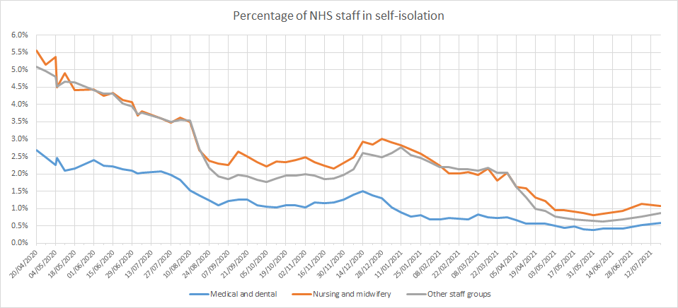 The percentage of NHS staff self-isolating decreased through April 2020 to May 2021 but has increased slightly since the beginning of June to between 0.6% for medical and dental staff to 1.1% for nursing and midwifery staff (figure 6).