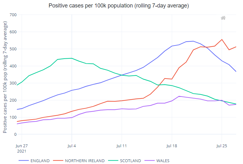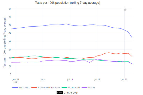 Over the last few days there is indication of plateauing rates, possibly starting to decline. It is too early to know if the latter is just a short-lived response to the end of the school term, or a more meaningful improvement. We are awaiting unbiased estimates of infection from ONS Covid Infection Survey which is lagged by around a week. It is also not known whether the reduction reflects a similar reduction in test seeking behaviour for younger adult. Fewer tests have been undertaken over the past week. Case positivity rates are high at 10.8% at a national level for the 7 day period ending 23 July.
