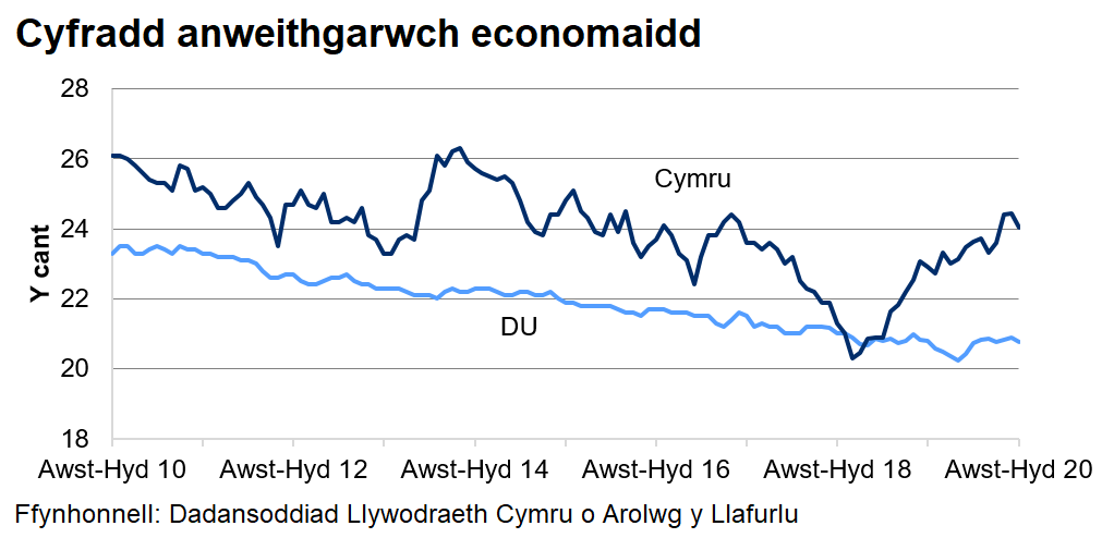 DU: Roedd y gyfradd anweithgarwch economaidd ar gyfer y DU yn 20.8%. Nid yw hyn wedi newid ers y chwarter ac mae 0.1 pwynt canran yn is nag ers yr un cyfnod flwyddyn ynghynt.