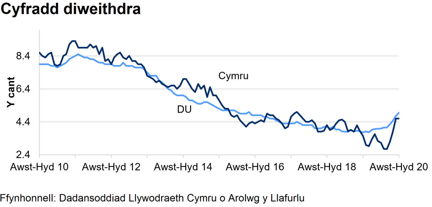 Cymru: Roedd y gyfradd diweithdra yng Nghymru yn 4.6%, i fyny 1.4 pwynt canran ers y chwarter blaenorol ac i fyny 1.0 pwynt canran ers yr un cyfnod flwyddyn ynghynt. Fis diwethaf, gwelwyd y cynnydd chwarterol mwyaf yn y gyfradd diweithdra yng Nghymru ers i gofnodion ddechrau yn 1992.