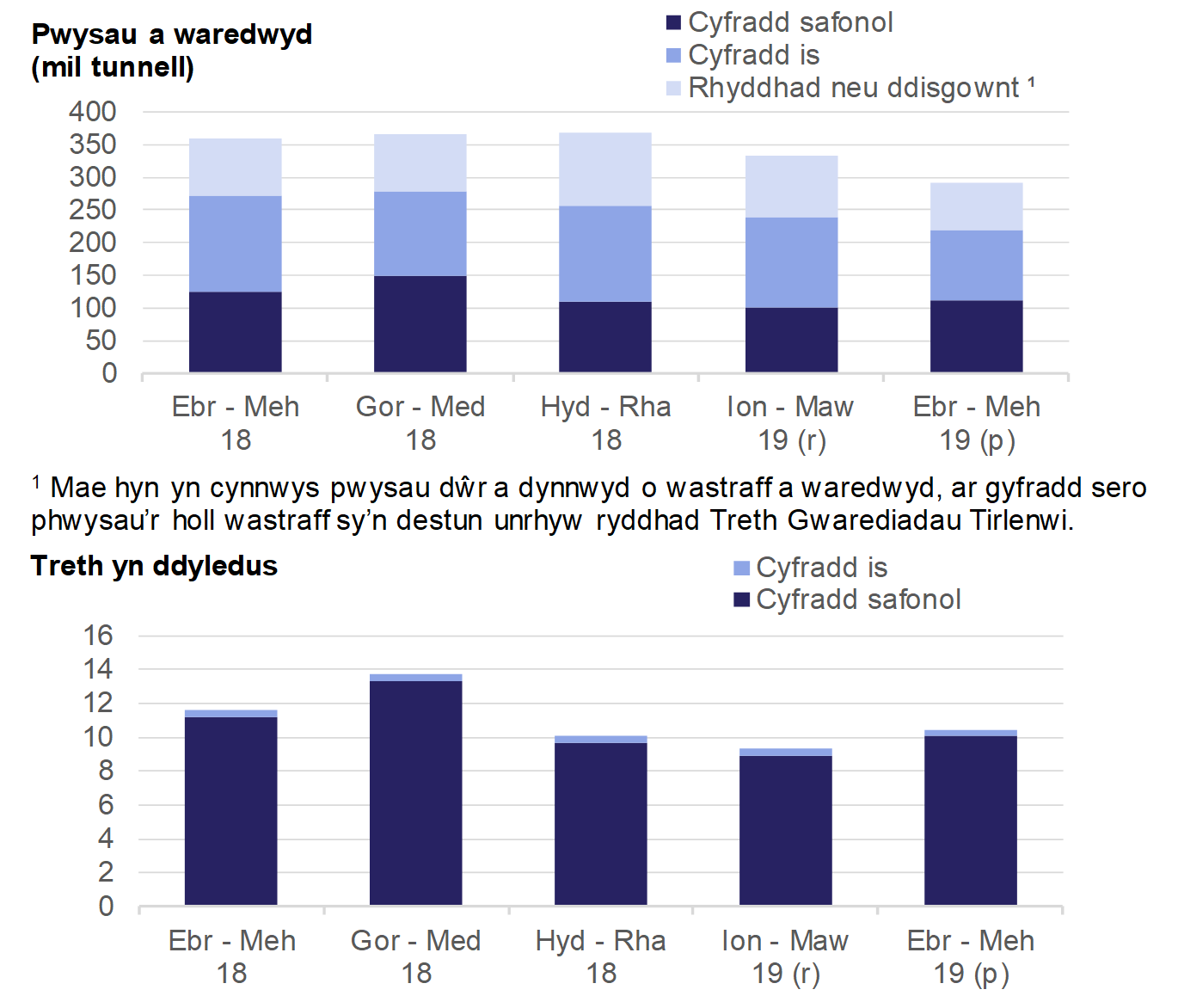Arweiniodd y gwarediadau hyn ar gyfer Ebrill i Fehefin 2019 at £10.4 miliwn o dreth yn ddyledus lleihad o 10% ers yr un cyfnod yn 2018. Y prif reswm am hyn oedd lleihad mewn gwarediadau ar y gyfradd safonol gan nifer bach o weithredwyr safleoedd tirlenwi.