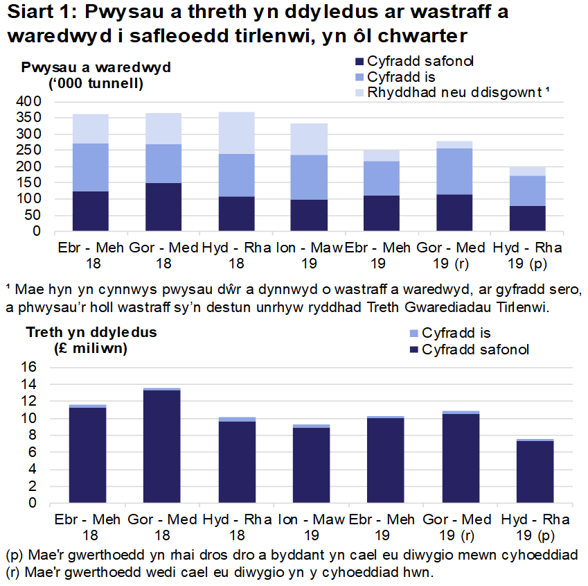 Arweiniodd y gwarediadau hyn ar gyfer Hydref i Ragfyr 2019 at £7.6 miliwn o dreth yn ddyledus lleihad oddeutu un ran o bedair ers yr un cyfnod yn 2018. Y prif reswm am hyn oedd lleihad mewn gwarediadau ar y gyfradd safonol gan nifer bach o weithredwyr safleoedd tirlenwi.