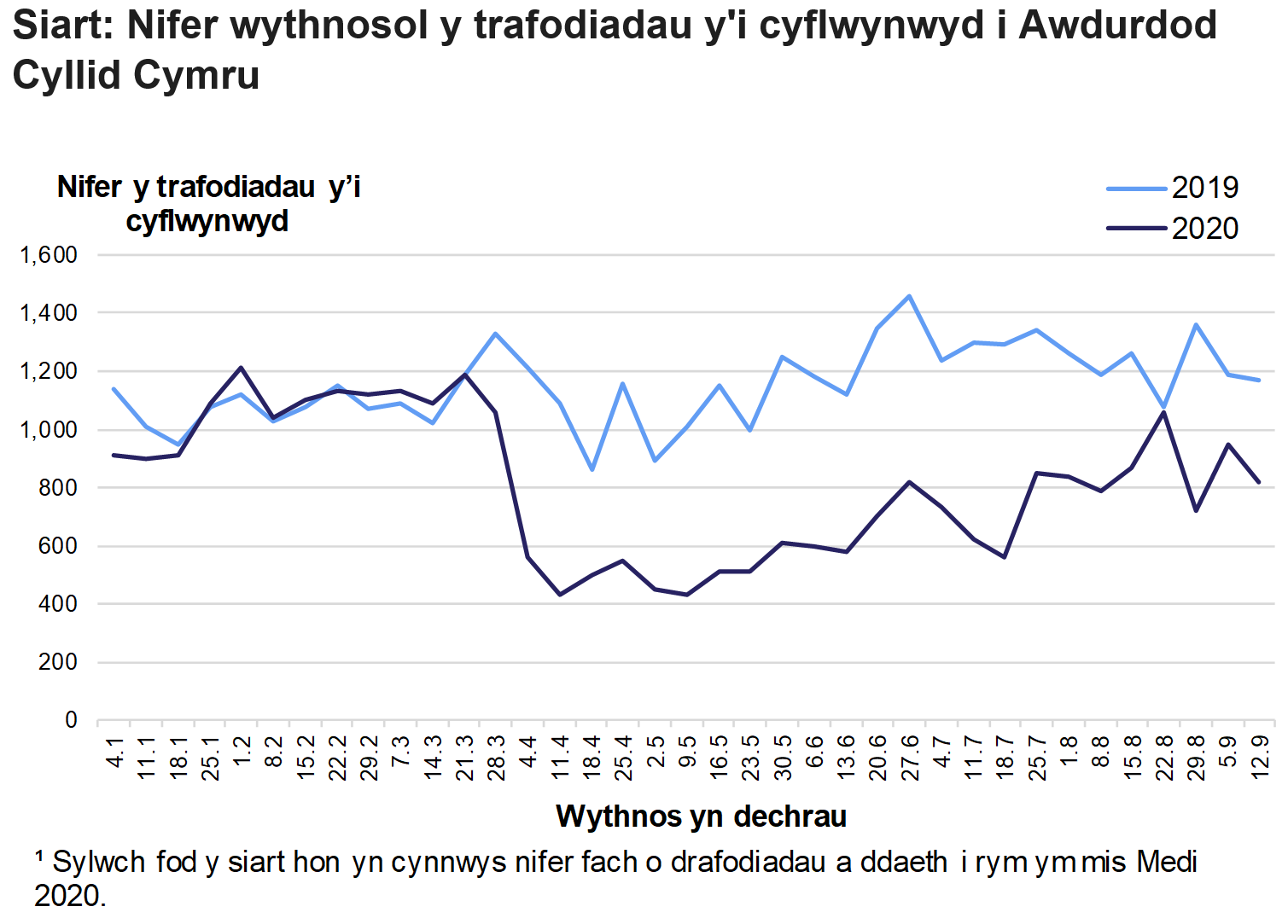 Yn ein datganiad chwarterol ar gyfer Ebrill i Fehefin 2020, gwnaethom gyflwyno’r nifer wythnosol y trafodiadau a gyflwynwyd i Awrdurdod Cyllid Cymru. Ar y tudalen hon, rydym wedi diweddaru’r siart o’r datganiad hwn (hyd at yr wythnos yn dechrau 12 Medi). Gwelwch y datganiad chwarterol ar gyfer Ebrill i Fehefin 2020 am sylwebaeth ac eglurhad o’r siart.