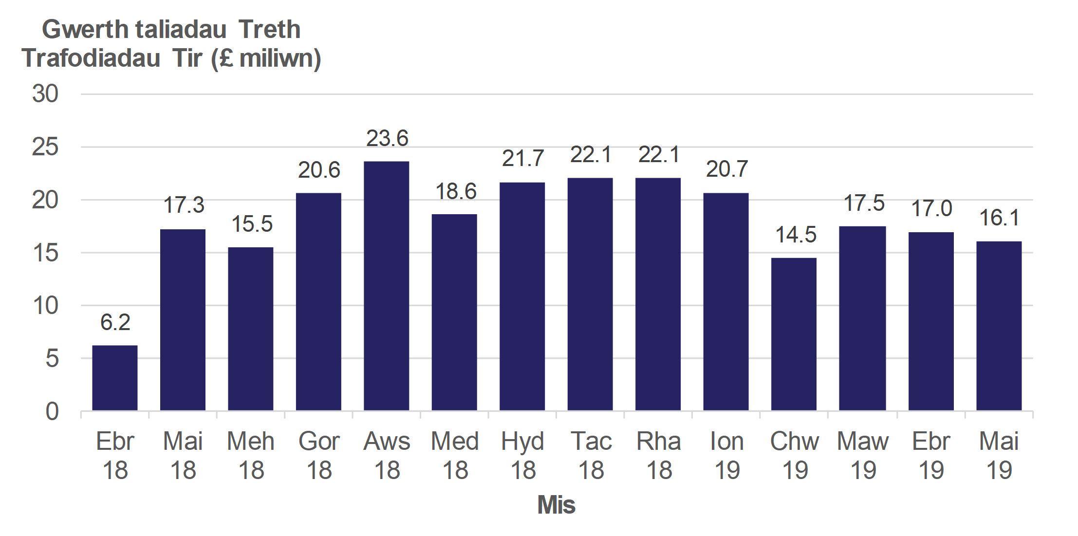 - Yn 2018-19, derbyniodd yr Awdurdod £220.2 miliwn mewn taliadau Treth Trafodiadau Tir. Mae'r ffigurau hyn yn llai na'r rhai a nodwyd yn Ffigur 2.2 gan eu bod yn ymwneud â'r taliadau a dderbyniwyd mewn gwirionedd bob mis (cyfeirir at hyn yn aml fel 'ar sail arian parod'), yn hytrach na'r symiau oedd yn ddyledus ar drafodiadau a oedd mewn grym yn ystod y mis.
