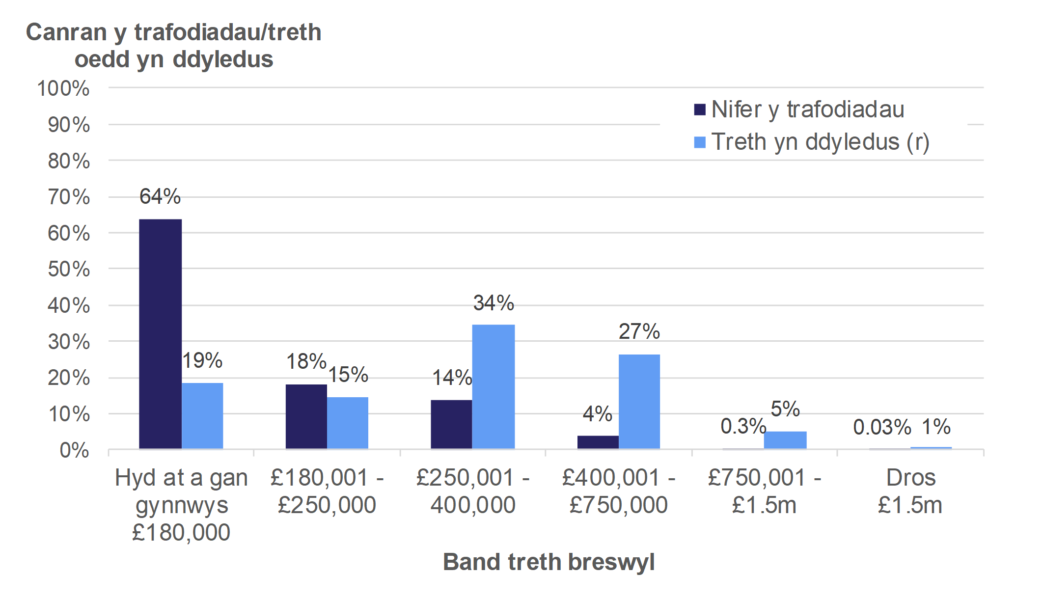 - Mae'r dreth oedd yn ddyledus ar gyfer trafodiadau amhreswyl hefyd yn gyfran fwy o gyfanswm y dreth oedd yn ddyledus nag ydyw o ran nifer y trafodiadau. Mae'r un peth yn wir am y refeniw ychwanegol o drafodiadau preswyl cyfraddau uwch.