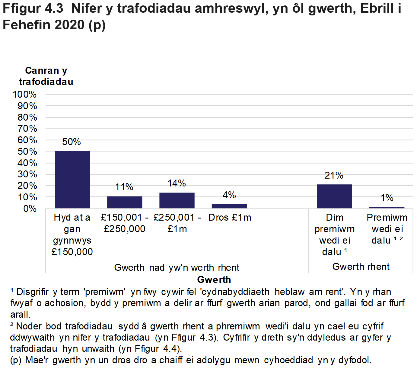Mae Ffigur 4.1 yn dangos bod nifer y trafodiadau ym mhob band gwerth o fis Ebrill i fis Mehefin 2020 wedi gostwng i'r gwerthoedd chwarterol isaf a welwyd hyd yma. Roedd hyn oherwydd effaith y coronafeirws (COVID-19), yn enwedig ar gyfer mis Mai a Mehefin 2020.