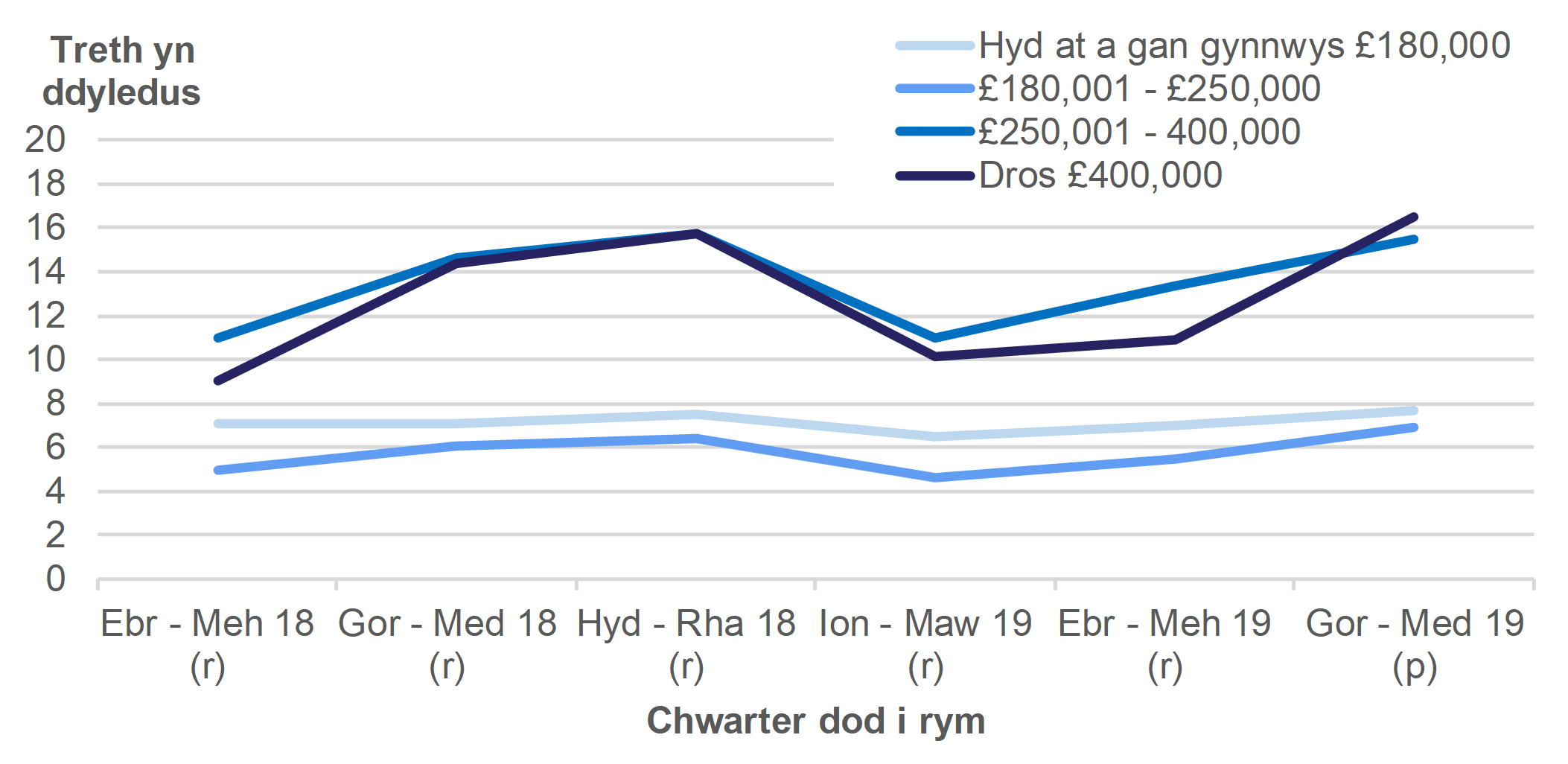 Ar wahân i hynny, roedd y gwerth rhent ar gyfer lesoedd amhreswyl oedd newydd eu rhoi yn £307 miliwn yng Ngorffennaf i Fedi 2019. Mae’n is nag yn yr un cyfnod yn 2018.