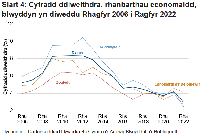 Ers 2011, y duedd gyffredinol oedd i’r cyfraddau diweithdra ostwng yng Nghymru ac yn y tri rhanbarth economaidd yng Nghymru, cyn pandemig y coronafeirws (COVID-19), gyda’r gyfradd yn gyson uwch yn y De-ddwyrain ac yn gyson is yn y Gogledd o’u cymharu â rhanbarthau eraill. Ers 2020, mae’r gyfradd ddiweithdra yng Nghymru a’r tri rhanbarth economaidd wedi gwahanu, gyda’r gyfradd uchaf yn y Canolbarth a’r De-orllewin o 2021 ymlaen.