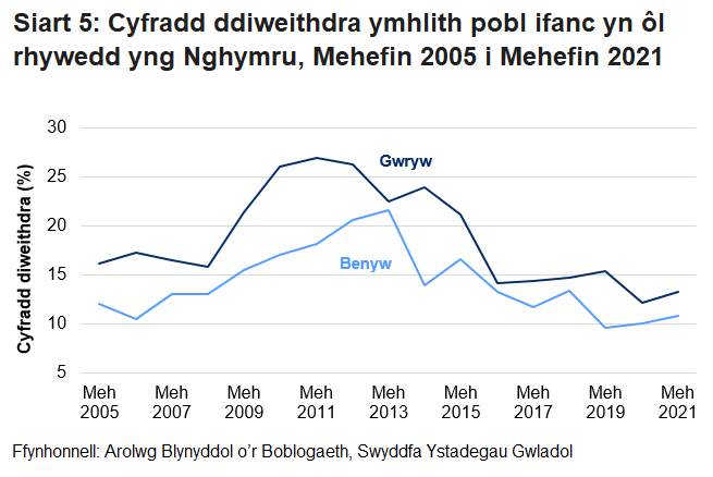 Roedd y gyfradd ddiweithdra ymhlith dynion ifanc yn uwch nag ymhlith menywod yng Nghymru, sef 13.2% a 10.8% yn y drefn honno.