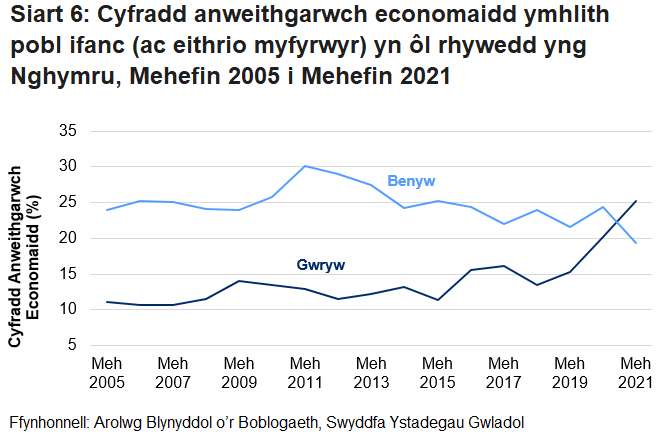 Cynyddodd y gyfradd anweithgarwch economaidd ymhlith dynion ifanc 5.1 pwynt canran o'i chymharu â'r flwyddyn flaenorol, lle gostyngodd y gyfradd ar gyfer menywod 5.0 pwynt canran. Erbyn hyn mae dynion yn uwch na menywod am y tro cyntaf ers i'r gyfres ddechrau.